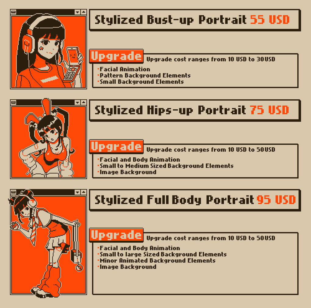 Rates may vary depending on canvas size and amount of details. Send a direct message or an email to get a quotation!